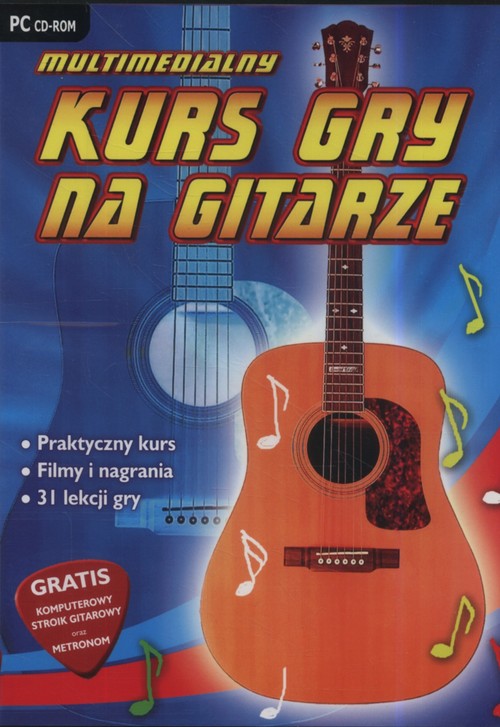 Przeznaczony dla początkujących - rozpoczynających swoją przygodę z gitarą. Nie trzeba znać nut, ani posiadać innej wiedzy muzycznej, by bez problemów nauczyć się grać. Wystarczą chęci, wytrwałość i dobry kurs. Autor kursu, to gitarzysta praktyk, człowiek dla którego instrument nie ma żadnych tajemnic. Multimedialny Kurs Gry na Gitarze PLUS to aż 31 lekcji zawierających wszystko czego potrzeba, by w spokojnej domowej atmosferze i w swoim tempie nauczyć się gry na gitarze. Kurs zawiera filmy instruktażowe oraz nagrania pomagające i ułatwiające naukę. Poszczególne fragmenty lekcji są ilustrowane dźwiękowo, a filmy demonstrują najważniejsze elementy gry. Innowacyjny interaktywny gryf pozwala poznać jak zagrać dźwięki i skale. - Praktyczny kurs gry - Filmy i nagrania - Interaktywny gryf - 31 multimedialnych lekcji Kurs, w wersji dla komputerów PC, został wzbogacony o dwa niezwykle przydatne początkującym gitarzystom programy: 1) Tuner gitarowy - pozwalający bezproblemowo nastroić gitarę 2) Metronom - bardzo przydatny w trakcie ćwiczeń, pozwala łatwo trzymać tempo