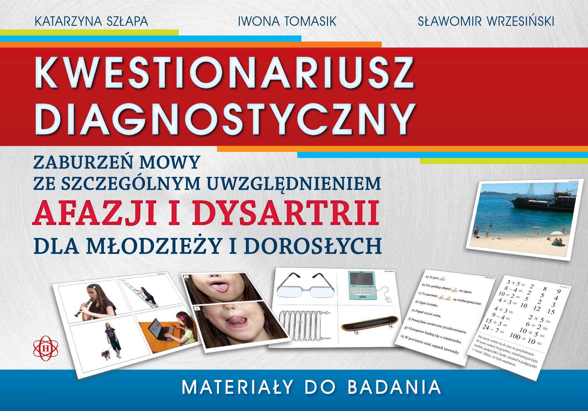 KWESTIONARIUSZ DIAGNOSTYCZNY zaburzeń mowy ze szczególnym uwzględnieniem afazji i dysartrii dla młodzieży i dorosłych.Materiał graficzny - zbiór 18 załączników zawierających kolorowe ilustracje, zdjęcia oraz materiał werbalny, za pomocą których przeprowadza się diagnozę.