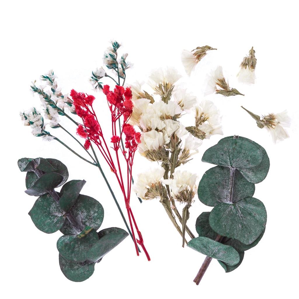 Suszone kwiaty dekoracyjne w 4 kolorach: malinowym różu, ecru, zielonym oraz białym.