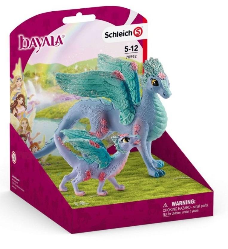 Kwiatowe smoki, mama i dziecko 70592 to zestaw, który zawiera prześliczną kwiecistą smoczycę i jej słodkie dziecko z serii Schleich(R) bayala(R). Wśród rozległych kwiecistych pól z serii Schleich(R) bayala(R) mieszkają kwiecista smoczyca i jej słodkie dziecko. Mały smok znalazł tam nowego przyjaciela: małe dzikie źrebię kwiecistego jednorożca. Razem świetnie się bawią. Czasem odwiedzają ich Marween i Piuh i wtedy wszyscy razem hasają po kwiecistych łąkach, a kwiecista smoczyca i kwiecisty pegaz przyglądają się słodkiej gromadce.