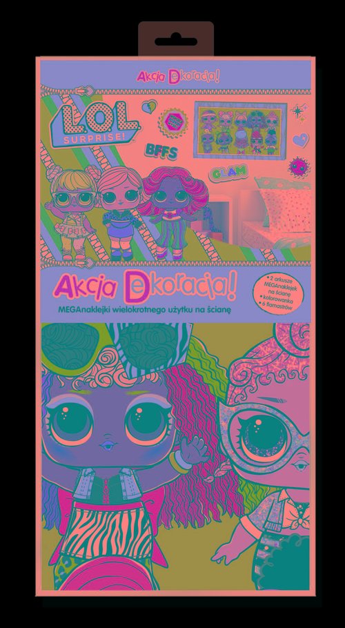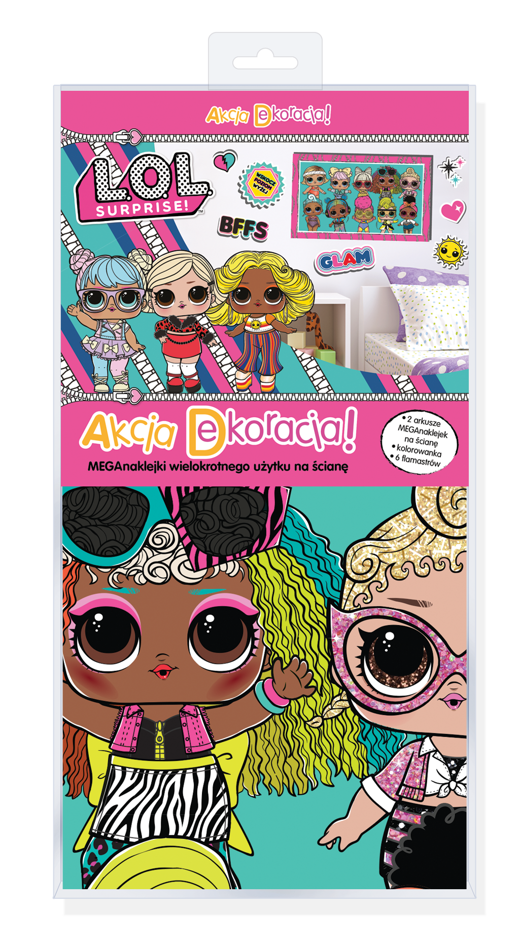 Książki z serii AKCJA DEKORACJA to kolorowe zestawy kreatywne z popularnymi bohaterami. W środku dziecko znajdzie dwa arkusze MEGA naklejek wielokrotnego użytku na ścianę ze swoimi ulubieńcami, które mogą ozdobić jego pokój i wywoływać uśmiech na twarzy! W zestawie także kolorowanka oraz sześć flamastrów - wystarczy, że dziecko pomaluje obrazek, a rysunki nabiorą kolorów.