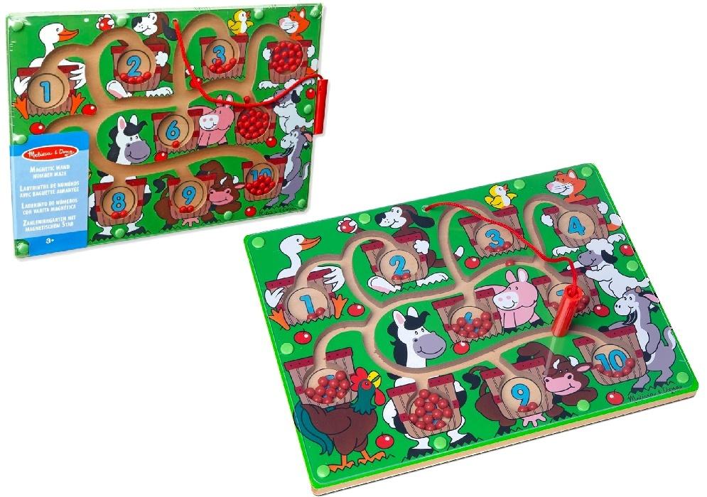 Drewniany labirynt magnetyczny Melissa & Doug Farma z liczbami to kolorowa gra edukacyjna przeznaczona dla dzieci od 3 roku życia. Na planszy przedstawiono wesołą farmę z uroczymi zwierzętami i ponumerowanymi wiaderkami, do których należy doprowadzić metalowe kulki za pomocą magnetycznego rysika. Zabawka w atrakcyjny sposób wspiera naukę liczenia, rozwija koordynację wzrokowo-ruchową, koncentrację, cierpliwość i logiczne myślenie.