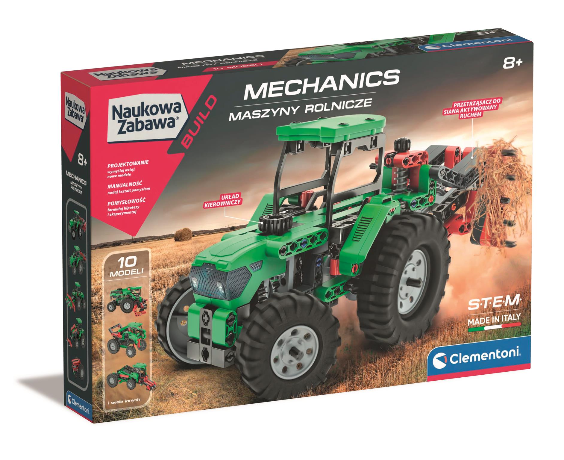Oto zestaw Maszyn rolniczych, który przybliży ci działanie napędów mechanicznych. Bawiąc się 10. dynamicznymi modelami do składania, zobacz, jak działa przełożenie napędu z kołami zębatymi i przegubami kardana. Zestaw zawiera ponad 200 elementów, w tym kompletny mechanizm różnicowy, opony i felgi, koła zębate, przeguby kardana, dźwignie, drążki i panele. Dwie ilustrowane instrukcje zawierają wszelkie objaśnienia dotyczące sposobu składania modeli oraz szczegółowe informacje na temat mechaniki maszyn rolniczych. Pomyślany, zaprojektowany i opracowany we Włoszech.