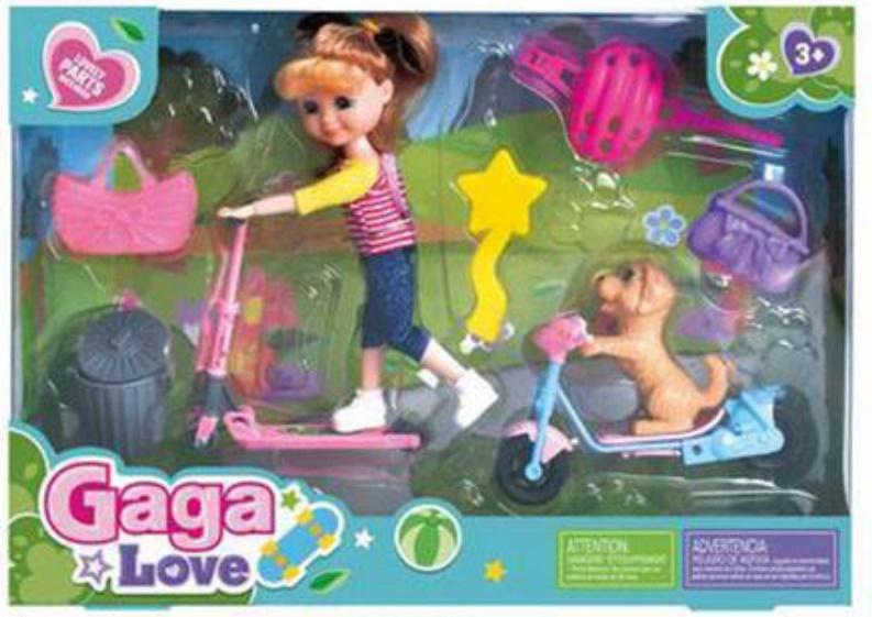 Laleczka 15 cm. Dodatkowe akcesoria: 2 hulajnogi, piesek, szczotka, kask, 2 torebki, śmietnik. Produkt nie potrzebuje baterii. Zabawka przeznaczona dla dzieci powyżej 3 roku życia.