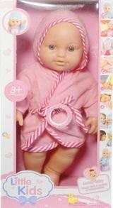 Urocza laleczka bobas w szlafroczku. Lalka potrafi pić, jeść, niuplać smoczek, a także wydaje dźwięki.Zabawka działa na baterie typu AG13. Baterie znajdują się w zabawce. Lalka przeznaczona dla dzieci od 3 lat. Podane wymiary stanowią wymiar opakowania. Lalka zapakowana w kartonowe opakowanie z przezroczystym okienkiem.