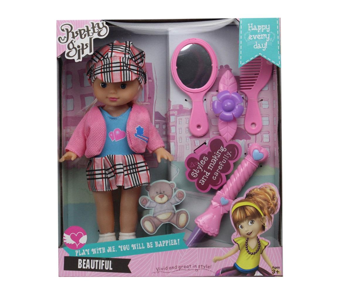 Laleczka z akcesoriami takimi jak: grzebień, lusterko, spinka i wałek.