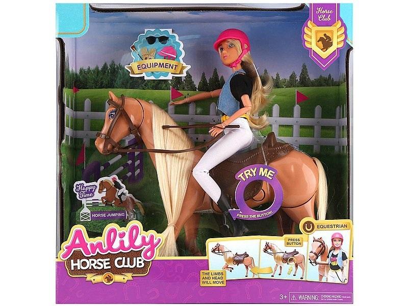 Lalka 29cm na koniu, zginalne kończyny lalki i konia; 35x33,5x11cm, W/B