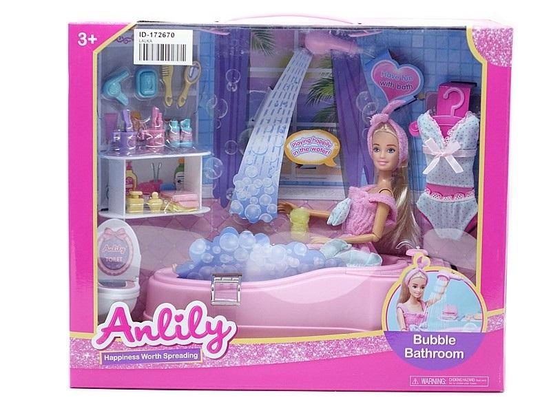 Zestaw lalka 29cm w łazience, wanna z funkcją wody z prysznica, wc, szafki z przyborami; 38x32x15cm, W/B