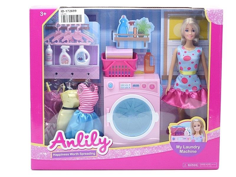 Zestaw lalka 29cm w pralni, pralka, zestaw ubrań, przybory do prania; 38x32x8cm, W/B