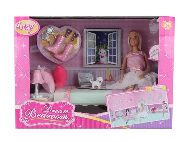Lalka kocha spędzać czas w swoim pokoju, który jest uroczy, nowoczesny i pełen niespodzianek! Znajdziesz tu łóżko,szafkę nocną, laptop, wysokie buty oraz ślicznego pupila. Dodatkowe akcesoria jak lusterko, szczotka oraz spinki uatrakcyjniają zabawę. Lalka wygląda uroczo w różowo białej sukience, a jej czarne buty uzupełniają modny styl.