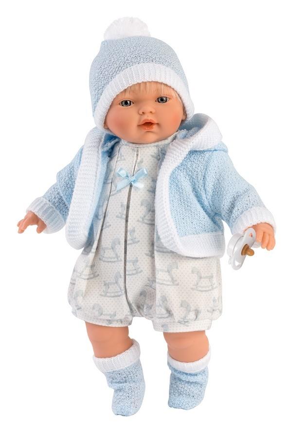 W naszej manufakturze wierzymy, że zabawa jest najlepszą nauką. Dlatego też z wielką miłością tworzymy kultowe lalki Llorens, w 100% ręcznie wykonane, o niepowtarzalnych wzorach. Stosowane przez nas tkaniny pochodzą od renomowanych marek odzieży dziecięcej. Wszystkie lalki Llorens są zgodne z europejskimi przepisami dotyczącymi bezpieczeństwa dzieci, co gwarantuje, że Twoje dzieci będą się bawić w możliwie najbezpieczniejszy sposób. Lalka płacząca Roberto mierzy 33 cm wzrostu. Buzia, rączki oraz nóżki wykonane są z delikatnego, przyjemnego w dotyku winylu, zaś brzuszek jest miękki, co czyni, iż lalka jest idealna do przytulania. Niebieskie oczka, malutki nosek, uszka, małe usteczka i pyzate policzki to cechy tej lali. Nigdy nie rozstaje się ze swoim ukochanym smoczkiem, gdy ktoś chce go zabrać, zapłacze i zawoła ""Mama"", ""Pappa"", uspokaja się po włożeniu smoczka do buzi. Chłopiec posiada blond włosy ukryte pod ciepłą, wełnianą czapką w kolorze biało-niebieskim z białym, puchatym pomponem na czubku. Roberto ubrany jest w białe, nakrapiane rampersy z motywem koników na biegunach, ozdobione niebieską, atłasową kokardką; bluzę z kapturem w kolorze niebiesko-białym oraz ciepłe skarpetki pasujące do kompletu. Lalka została zapakowana w ozdobny karton, więc bez zbędnych dodatkowych opakowań, może być wręczona jako prezent. Jest to wspaniała zabawka dla dzieci w każdym wieku. Kochamy hiszpańskie lalki Llorens!