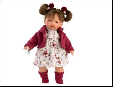 Lalka płacząca Vera 33 cm została ubrana w jasną sukieneczkę w kwiatki, bordową bluzę z kapturem, bloomersy oraz skarpetki.