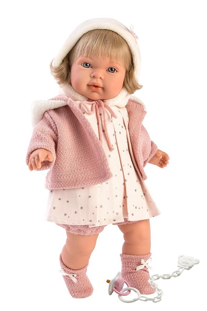 Lalka płacząca Carla 42 cm została wyprodukowana w Hiszpanii przez markę Llorens. Jest to zabawka dla dzieci w każdym wieku. Okrągła buźka i delikatne dołeczki na twarzy Carlii powodują, że wygląda jak prawdziwe dziecko. Jej różowa stylizacja została wykonana z miękkich materiałów by zapewnić dziecku wysoki komfort zabawy. Carla bardzo lubi swój smoczek, więc gdy go jej zabierzemy będzie płakać i wołać mama, papa. Ruchome rączki, nóżki i główka zostały wykonane z winylu, natomiast brzuszek z materiału i wypełniony wyściółką. Lalka została zapakowana w ozdobny karton. Kochamy hiszpańskie lalki Llorens!