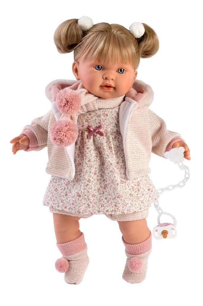W naszej manufakturze wierzymy, że zabawa jest najlepszą nauką. Dlatego też z wielką miłością tworzymy kultowe lalki Llorens, w 100% ręcznie wykonane, o niepowtarzalnych wzorach. Stosowane przez nas tkaniny pochodzą od renomowanych marek odzieży dziecięcej. Wszystkie lalki Llorens są zgodne z europejskimi przepisami dotyczącymi bezpieczeństwa dzieci, co gwarantuje, że Twoje dzieci będą się bawić w możliwie najbezpieczniejszy sposób. Lalka płacząca Alexandra mierzy 42 cm wzrostu. Buzia, rączki oraz nóżki wykonane są z delikatnego, przyjemnego w dotyku winylu, zaś brzuszek jest miękki, co czyni, iż lalka jest idealna do przytulania. Duże, niebieskie oczka, malutki nosek, uszka, małe błyszczące usteczka i pyzate policzki to cechy tej lali. Dziewczynka nigdy nie rozstaje się ze swoim ukochanym smoczkiem, gdy ktoś chce go zabrać, zapłacze i zawoła ""Mama"", ""Pappa"", uspokaja się po włożeniu smoczka do buzi. Lalka ma gęste blond włosy do ramion z grzywką, związane w dwa kucyki, zwieńczone gumkami do włosów z puchatymi pomponami. Alexandra ubrana jest w kwiecistą sukienkę z odcięciem i kokardką, różowy sweterek z kapturem, długie skarpetki z pomponami oraz w szaliczek z pomponami. Lalka została zapakowana w ozdobny karton, więc bez zbędnych dodatkowych opakowań, może być wręczona jako prezent. Kochamy hiszpańskie lalki Llorens!