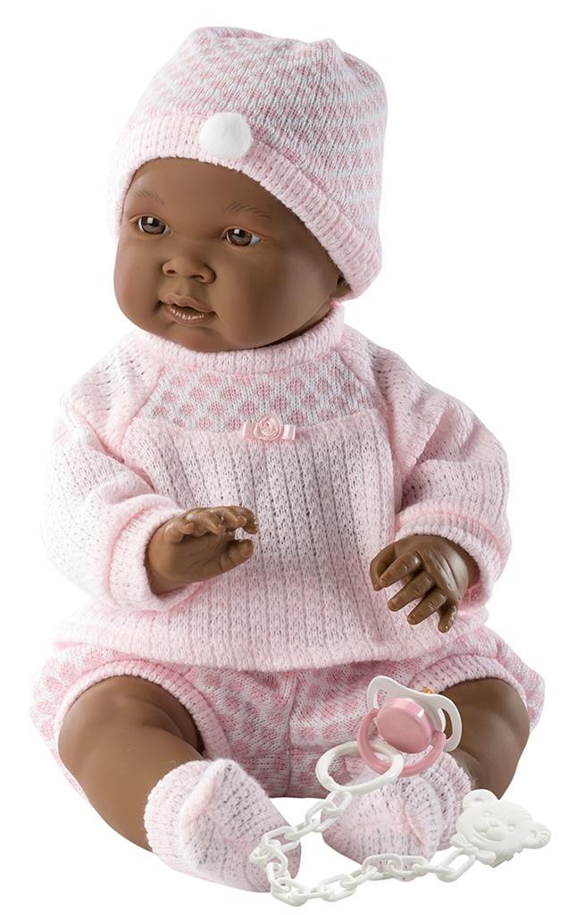 Lalka bobas Nahia 45 cm została wyprodukowana przez hiszpańską markę Llorens. Jest to wspaniała zabawka dla dzieci w każdym wieku. Jej ruchome rączki zapewniają dziecku rozmaitą zabawę. Całe ciało Nahii zostało wykonane z przyjemnego w dotyku winylu, dzięki czemu lalkę można kąpać zanurzając ją w wodzie do poziomu szyi. Dla Nahi przygotowano stylizację składającą się z różowego sweterka, spodenek, skarpetek i czapeczki. Do zestawu dołączono ozdobny smoczek. Lalka została zapakowana w ozdobny karton. Kochamy hiszpańskie lalki Llorens!