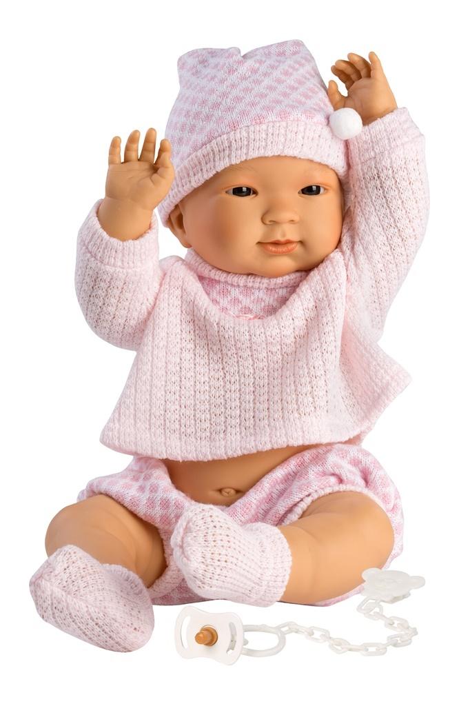 W naszej manufakturze wierzymy, że zabawa jest najlepszą nauką. Dlatego też z wielką miłością tworzymy kultowe lalki Llorens, w 100% ręcznie wykonane, o niepowtarzalnych wzorach. Stosowane przez nas tkaniny pochodzą od renomowanych marek odzieży dziecięcej. Wszystkie lalki Llorens są zgodne z europejskimi przepisami dotyczącymi bezpieczeństwa dzieci, co gwarantuje, że Twoje dzieci będą się bawić w możliwie najbezpieczniejszy sposób. Bobas Lian mierzy aż 45 cm wzrostu. Lian przypomina swoim wyglądem prawdziwe dziecko w wieku niemowlęcym. To podobieństwo zapewnią jej okrągłe, delikatnie zarumienione policzki, malutki nosek oraz liczne fałdki na zgięciach rączek i nóżek. To lalki płci żeńskiej. Całe ciało lalki zostało wykonane z delikatnego, przyjemnego w dotyku winylu, dzięki czemu można ją kąpać zanurzając w wodzie do poziomu szyi. Jej rączki i nóżki są ruchomymi elementami co zapewnia różnorodność zabawy. Lalka jest ubrana w sweterek, bloomersy, skarpetki oraz czapeczkę. Lalka została zapakowana w ozdobny karton i dołączono do niej ozdobny smoczek na łańcuszku, pełniący funkcję dekoracyjną. Kochamy hiszpańskie lalki Llorens!