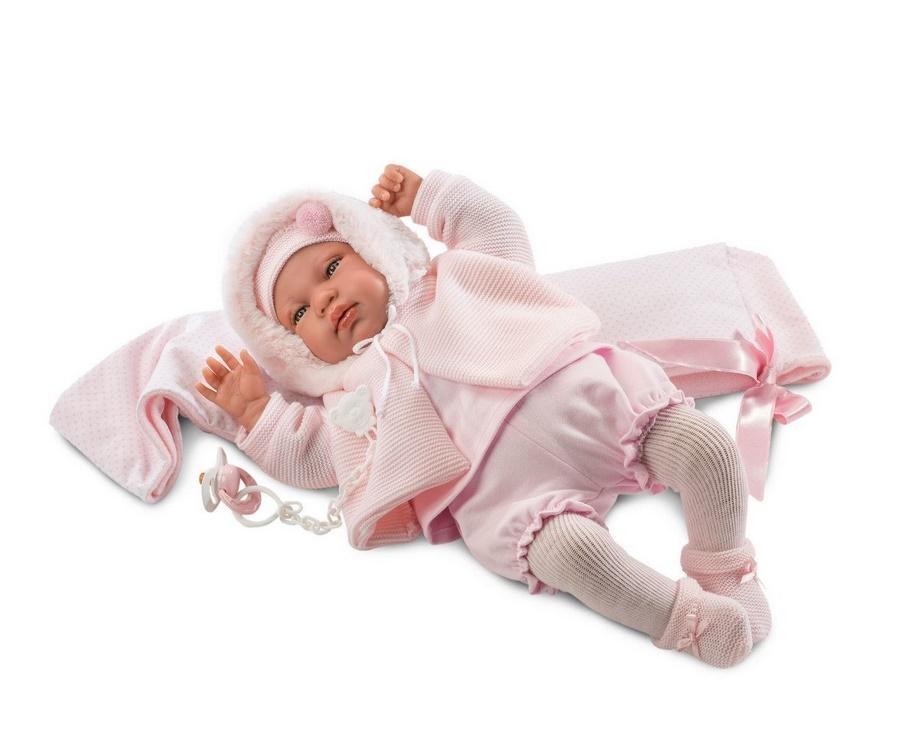 Lalka płacząca Beba 44 cm została wyprodukowana w Hiszpanii przez markę Llorens. Jest niezwykła zabawka dla dzieci z dopracowanymi wszelkimi szczegółami. Beba wyglądem przypomina prawdziwe dziecko w wieku niemowlęcym. Gdy naciśniemy jej brzuszek, będzie płakać i wołać mama, papa. Beba ma materiałowy brzuszek wypełniony miękką wyściółką. W zestawie znajduje się różowa chusta, w której możemy nosić lalkę. Lalka została zapakowana w ozdobny karton. Załączony smoczek pełni funkcję dekoracyjną.