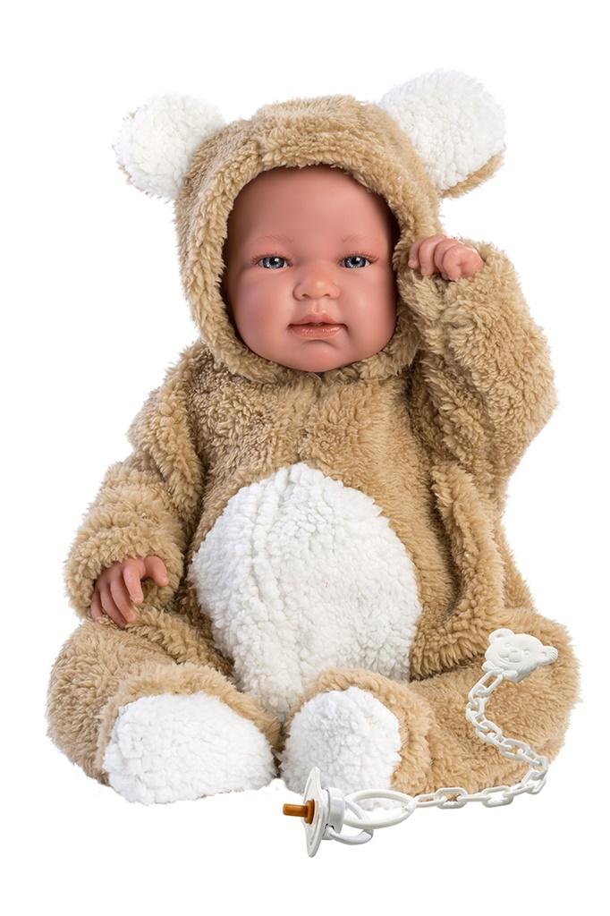 Wyprodukowana w Hiszpanii realistyczna lalka bobas 43 cm marki Llorens jest zabawką dla dzieci w każdym wieku. Ubrana jest w rozkoszny, pluszowy strój beżowego misia z białymi elementami, zapinany z przodu na rzep tak, aby ułatwić przebieranie lalki. Materiałowy brzuszek lalki wypełniono miękką wyściółką, po naciśnięciu go lalka zacznie płakać. Nie sposób nie pokochać lalki bobas, gdy jej urocza buźka swoimi okrągłymi policzkami, uroczymi dołeczkami i delikatnym noskiem stwarzają wygląd realnego niemowlęcia. Rączki i nóżki są ruchome, co pozwala na zmienianie pozycji i układanie lalki, może ona za równo leżeć w wózku na spacerze jak i siedzieć podczas zabawy. Lalka została zapakowana w ozdobny karton. Załączony smoczek pełni funkcję dekoracyjną. Kochamy hiszpańskie lalki Llorens!