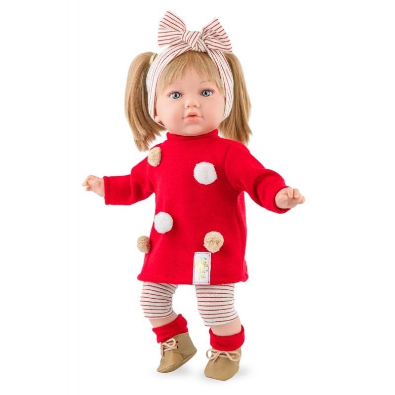 Poznaj otaczający świat z filigranową blondynką. Dziewczynka uzupełnia kolekcję lalek hiszpańskich Marina & Pau. Lalka o imieniu Alina Bella mierzy 45 cm wysokości. Ten egzemplarz to już starsza dziewczynka z dłuższymi włosami przeznaczona do czesania. Alina ma grzywkę na prosto, a resztę włosów spiętą w dwa kucyki. Najmłodsze pociechy mogą zadbać o stylizację włosów lub upiąć je w nową fryzurę, aby nadać zupełnie inny wygląd swojej ulubionej lali. Dodatkowo fryzurę dziewczynki podkreśla opaska w drobne czerwone paski.
