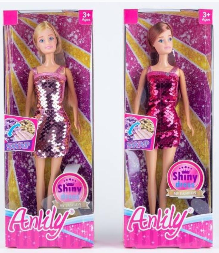 Lalka Anlily 30 cm w sukience z cekinami zmieniającymi kolor. Mix 2 wzorów. Produkt nie potrzebuje baterii. Zabawka przeznaczona dla dzieci powyżej 3 roku życia.