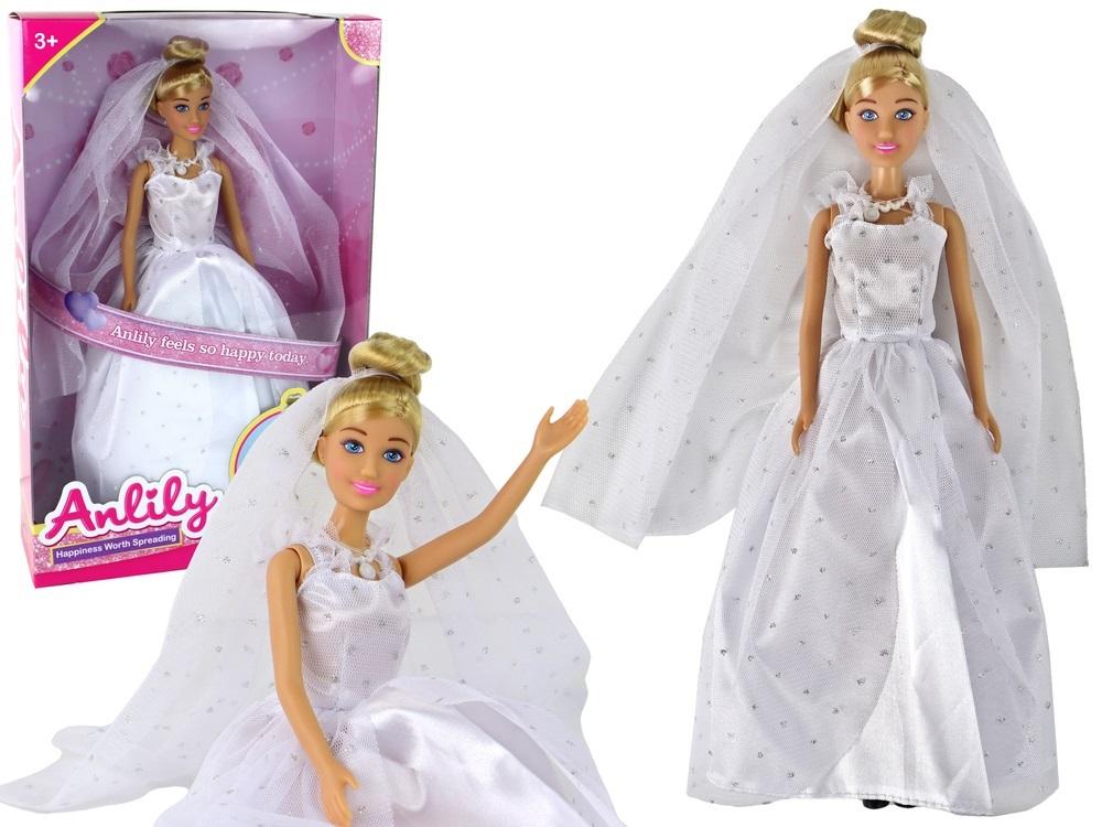 Lalka Anlily Panna Młoda Biała Suknia Ślub Lalka Anlily Panna Młoda to urocza zabawka, która zachwyca swoim eleganckim wyglądem i szczegółami. Jej główną cechą charakterystyczną jest przepiękny kok z włosów, który został starannie uczesany i ozdobiony długim, błyszczącym welonem. To welon sprawia, że lalka prezentuje się jak prawdziwa panna młoda, gotowa do swojego wielkiego dnia.Makijaż lalki Anlily jest bardzo starannie wykonany. Jej oczy są pomalowane, co nadaje im wyrazistości i delikatności, a usta mają subtelny kolor, który dodaje uroku całemu wyglądowi lalki. Szyję lalki zdobi piękny duży biały naszyjnik, który dodaje elegancji i przypomina biżuterię ślubną.