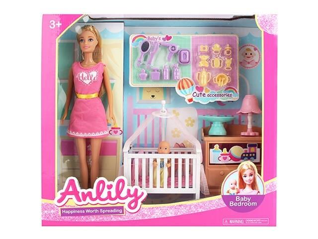 Lalka Anlily z dzieckiem w sypialni. Dodatkowe akcesoria: łóżeczko dla dziecka, komoda, lampka, zestaw grzechotek, buteleczka, lusterko, grzebyk, suszarka, zestaw kosmetyków. Produkt nie potrzebuje baterii. Zabawka przeznaczona dla dzieci powyżej 3 roku.
