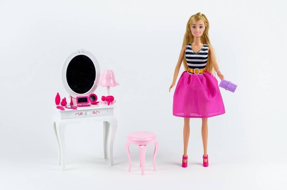 Lalka Anlily z toaletką. Dodatkowe akcesoria: pufa, torebka, lusterko, grzebyk, suszarka, zestaw kosmetyków, lampka. Produkt nie potrzebuje baterii. Zabawka przeznaczona dla dzieci powyżej 3 roku życia.