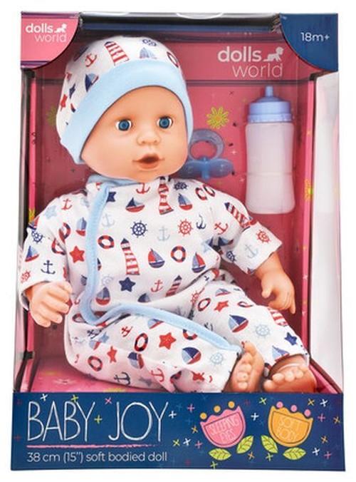 Lalka Baby Joy o wielkości 38cm wypełniona fasolką. Posiada śpiące oczka, wyjątkowy śpioszek, czapeczkę, buteleczkę i smoczka.