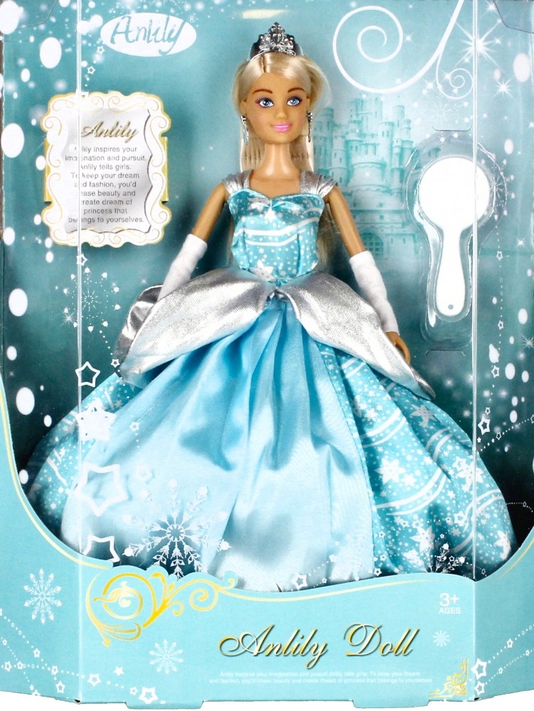Ubrana jest w oszałamiającą, długą suknię balową, która z pewnością zachwyci i zachęci najmłodszych do wspaniałej zabawy.