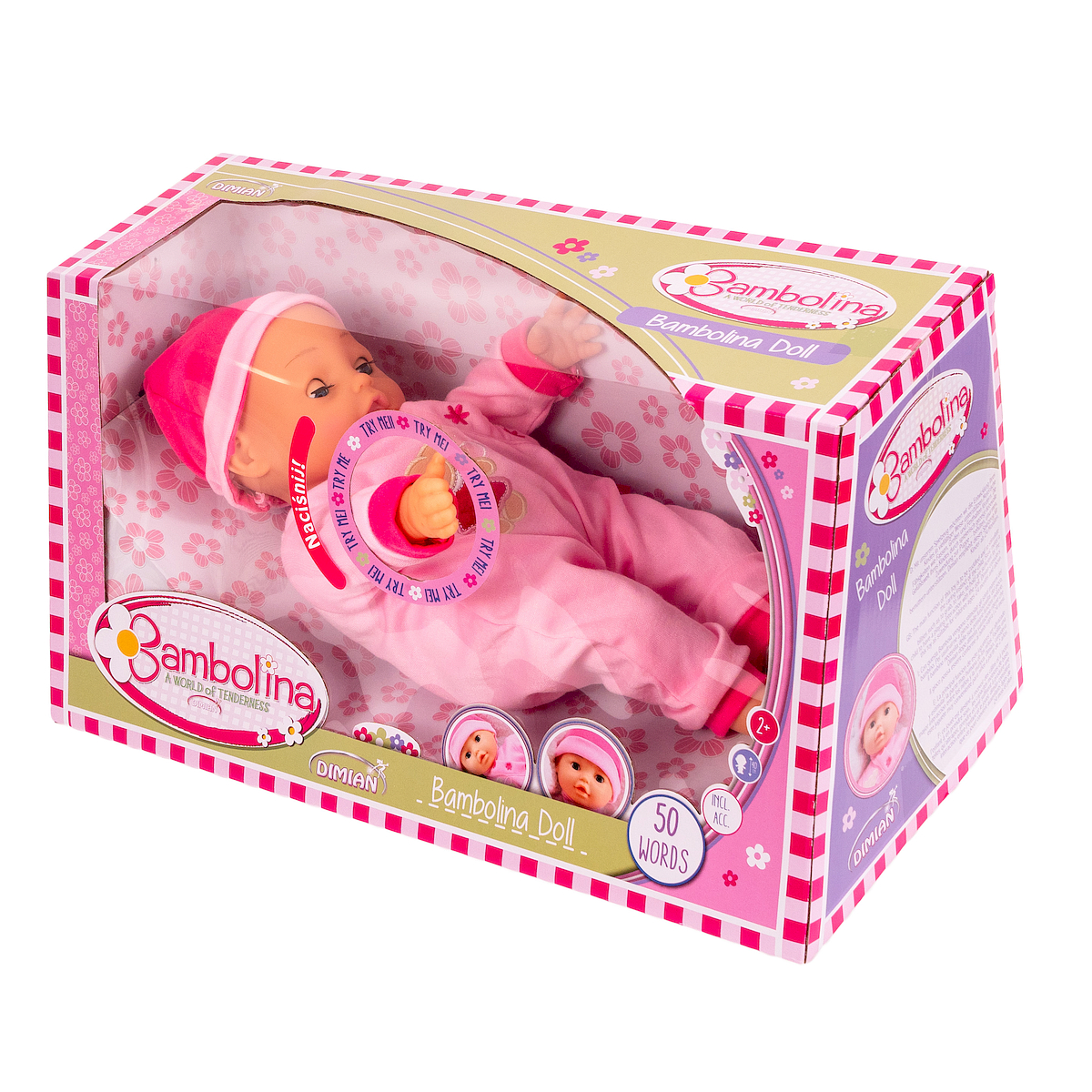 Bambolina to piękna lalka. Naciśnij jej brzuch, a wyda różne dźwięki. Rozmiar lalki 40 cm.