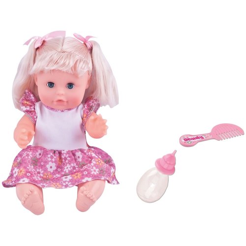 Lalka pije i sika. Ma ruchome oczy, długie włosy i kolorową sukienkę. Akcesoria zawierają: grzebień do czesania lalki i buteleczkę do karmienia. Wysokość lalki 30 cm. Wiek: 36m+