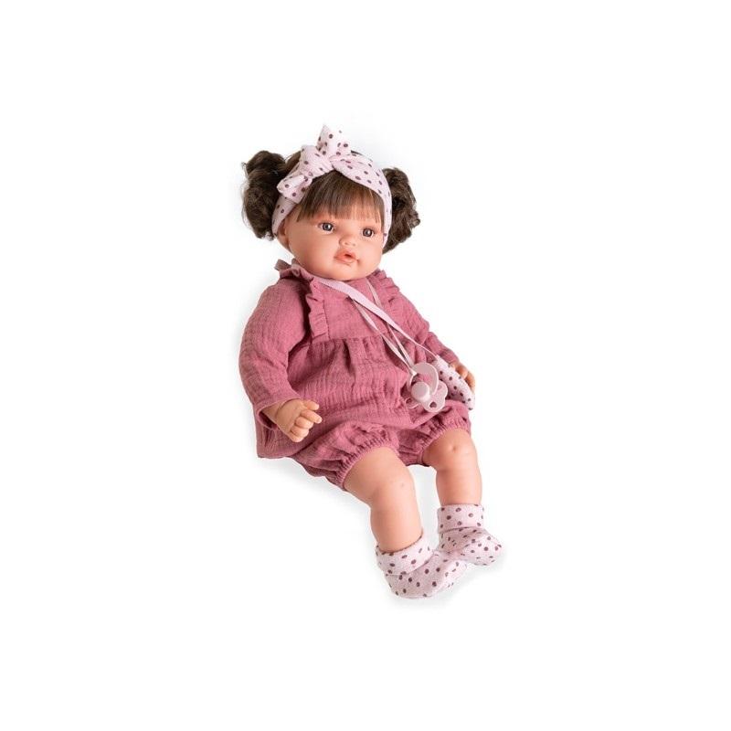 Urodę Beni podkreśla modny zestaw ubranek. Laleczka ma na sobie ładną, różową sukienkę na długi rękaw. Kreację odciętą w talii ozdabia marszczona faktura materiału i falbanki umieszczone przy ramionach. Dodatkowo strój wyposażono w krótkie spodenki. Sukieneczka i spodenki są z muślinu. Dziewczynka na nóżkach ma mięciutkie skarpetki w kropki, które są idealnie dopasowane do stópek laleczki. Elegancką dziewczynkę wyposażono również w małą poręczną torebkę na drobne rzeczy. Wszystkie ubranka można zdjąć z lali i na nowo samodzielnie ubierać.