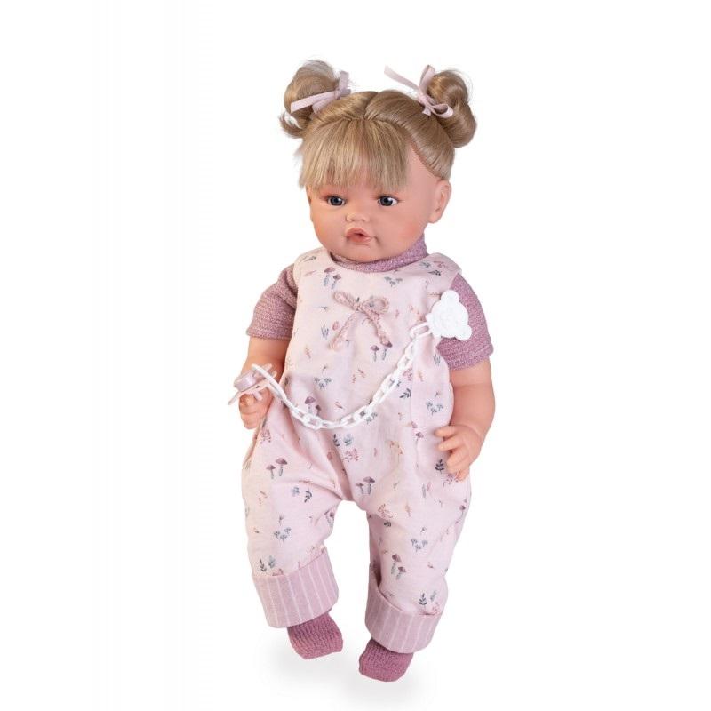 Przypominająca prawdziwe dziecko lalka hiszpańska 16381 ma stale otwarte, niebieskie oczy o głębokim spojrzeniu, opatrzone długimi rzęsami i delikatnie namalowanymi brwiami. Miękkie w dotyku policzki zdobią rumieńce. Uroku dziewczynce dodają blond włosy, związane w dwa kucyki.