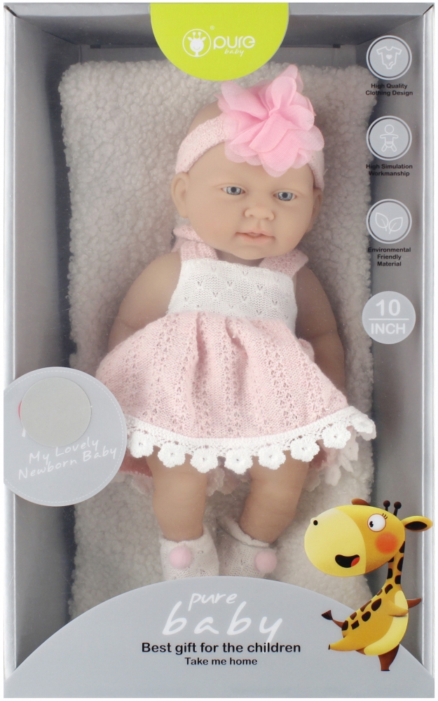 Zalety produktu. Nauka odpowiedzialności za drugą osobę, nauka samodzielności, rozwijanie wyobraźni dziecka, lalka 25 cm w sukience i opaską na głowie, na stopach ma skarpetki, lalka w całości wykonana z gumy.