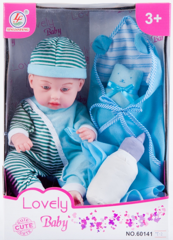 Zawartość zestawu: lalka bobas w ubranku, ręcznik, pluszowa zabawka, pluszowa butelka na mleko.
