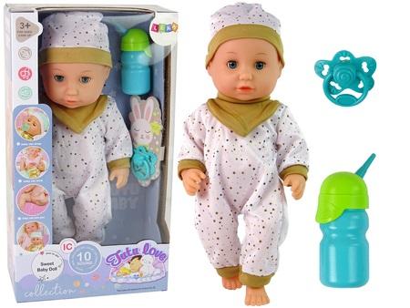 Lalka Bobas Siusia Dźwięki Smoczek Buteleczka Urocza lalka bobas zachwyci malucha. Zabawa będzie niezwykłym doświadczeniem, nauczy odpowiedzialności i empatii. Wymiar edukacyjny lalki zaprocentuje w przyszłości i pomoże wczuć się w ważną rolę, jaką jest opieka nad drugą osobą. Twoje dziecko uwielbia naśladować swoje kochające, troskliwe i opiekuńcze mamusie. Lalka ubrana jest w piękne białą piżamkę w gwiazdki. Na głowie bobasa znajduje się czapeczka. Do zestawu dołączony jest smoczek i butelka do picia w zielonym kolorem. Całość idealnie pasuje do siebie i wygląda wprost uroczo. Lalka ma ruchome ręce i nogi oraz główkę. Można ją umieścić na siedząco lub leżąco. Ubranko jest zdejmowane, co pozwoli na wymianę garderoby. Dzięki licznym funkcjom, takim jak ruchome powieki, a także umiejętności picia i siusiania, zachowuje się jak prawdziwe dziecko. Wydaje dźwięki charakterystyczne dla małego dziecka takie jak gaworzenie, płacz, ssanie smoczka, słodkie chrapanie oraz słowa - i love you, mama. Prezentowana lala wykonana jest twardej gumy, która świadczący o bezpieczeństwie płynącym z jej użytkowania, a także długiej żywotności zabawki. Elementy zestawu: - laleczka bobas - smoczek - butelka Długość lalki: 38 cm Wymiary pudełka: 39 cm x 21 cm x 12 cm Lalka przeznaczona jest dla dzieci powyżej 3 roku życia. Zabawka posiada certyfikat CE i jest zgodna z normą EN 71. Bobas zapakowany jest w kolorowe pudełko z przezroczystą witrynką, dzięki czemu nadają się na prezent dla dziecka. Baterie znajdują się w głośniku na brzuszku bobasa.