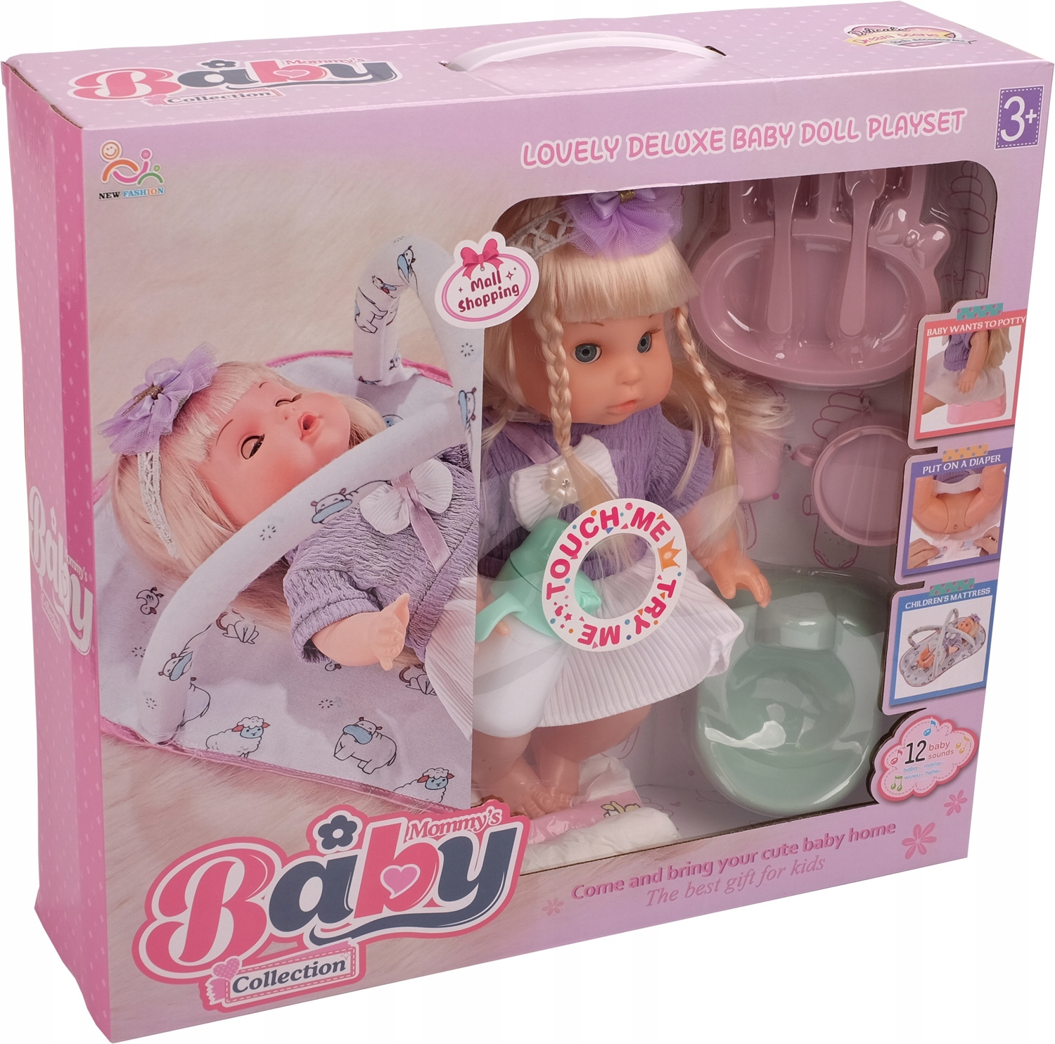 W zestawie jest lalka, nosidełko, pielucha, naczynia do karmienia, oraz ubranie