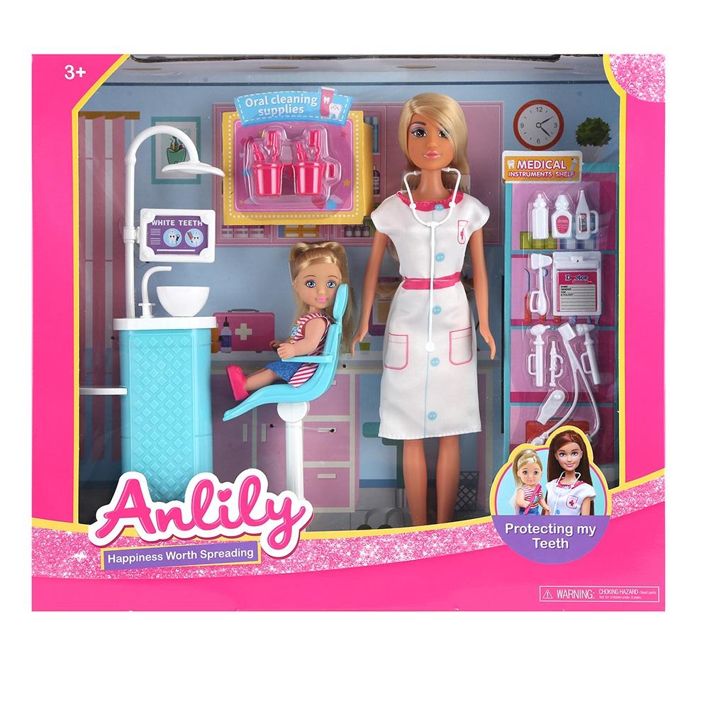 Lalka dentystka w gabinecie dentystycznym Lalka 30 cm + mniejsza lalka 12 cm; fotel dentystyczny, akcesoria dentystyczne, mała lalka jako pacjentka.