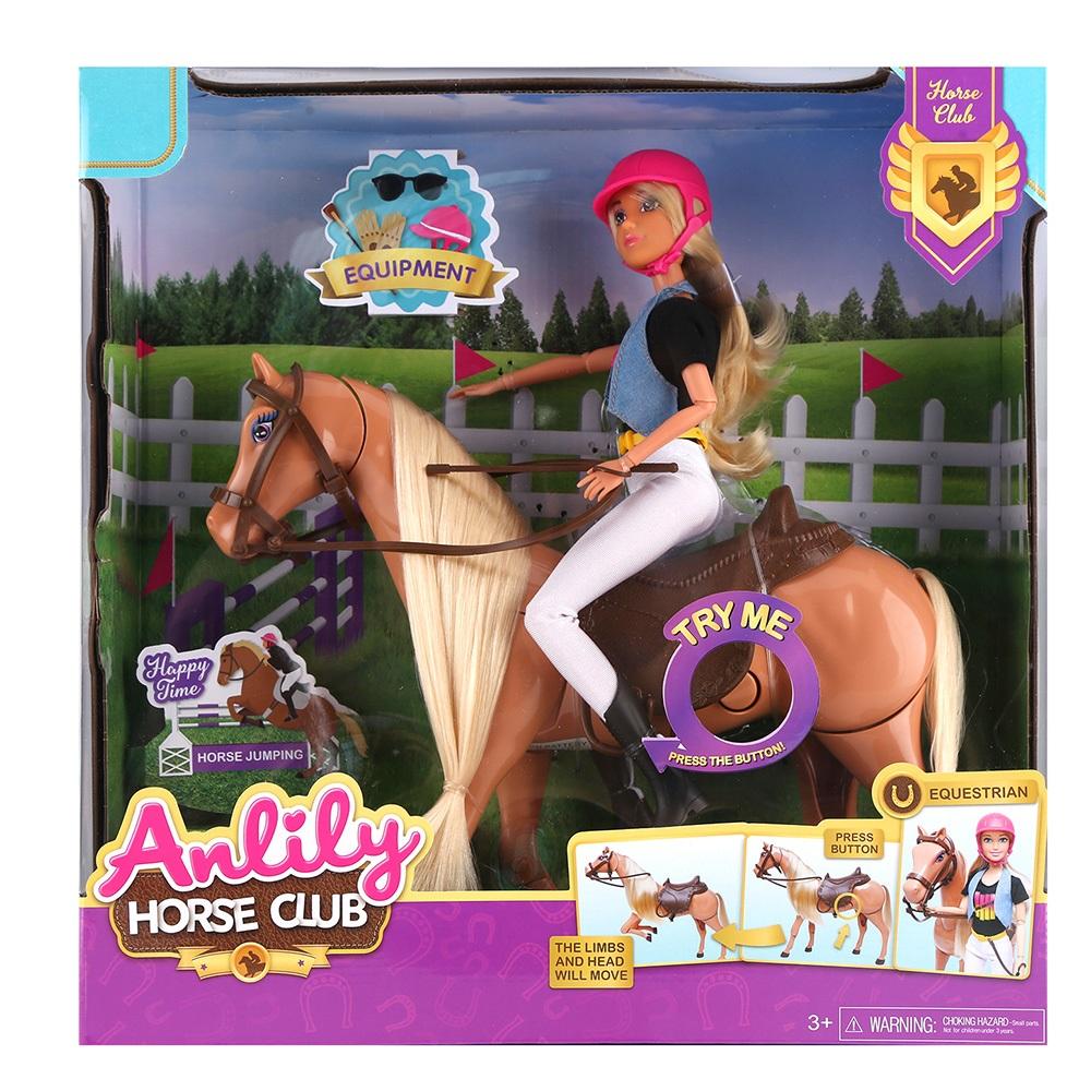 Lalka (29 cm) dżokejka z koniem. Koń porusza głową i przednimi nogami ( po naciśnieciu przycisku) Akcesoria do lalki: okulary przeciwsłoneczne, czapka dżokejka