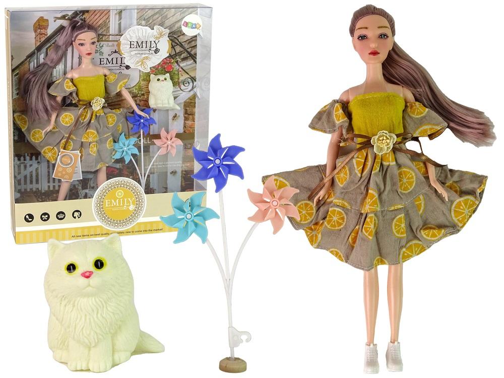 Lalka Emily z Wiatrakiem Kotek Dla Dzieci Przedstawiamy lalkę Emiliy z wiatrakami i uroczym przyjacielem kotkiem. Produkt pozwala dziecku rozwijać swoją wyobraźnię poprzez zabawę z dołączonymi do zestawu produktami. Pozwala na naukę kreatywnej opieki nad zwierzątkiem a także stwarzać historię dwóch przyjaciół na świeżym powietrzu. Zestaw stymuluje kreatywność, rozwija umiejętności społeczne i zapewnia niekończącą się zabawę oraz pozwala czerpać radość z niekończącej się zabawy. Ten wyjątkowy zestaw może być wspaniałym prezentem dla małych entuzjastów lalek. Dzięki figurce kociaka, który będzie towarzyszył Emily w wspólnych przygodach zabawa nabierze jeszcze większej radości i realizmu a także niezwykłych emocji. Przy projekcie produktu zadbano o jakość i dokładność detali. Postać Emily posiada zwiewną przepiękną sukienkę ze wzorem pomarańczy, pasek z kwiatkiem oraz białe buciki dodając jej sportowego stylu, porusza rękami i nogami jak również głową. Lalka ma piękne niebieskie oczy długie włosy. Kotek po naciśnięciu oddaje dźwięki piszczenia a jego sierść jest biała. Elementy w zestawie: - lalka Emily - trzy wiatraczki -kotek Wymiary lalki: długość: 30cm szerokość: 8cm Wymiary kotka: długość: 5cm szerokość : 4cm Wymiary opakowania: długość: 33cm szerokość: 28cm grubość: 6cm Zabawka przeznaczona jest dla dzieci powyżej trzeciego roku życia oraz posiada certyfikat CE i jest zgodny z normą ENF1.