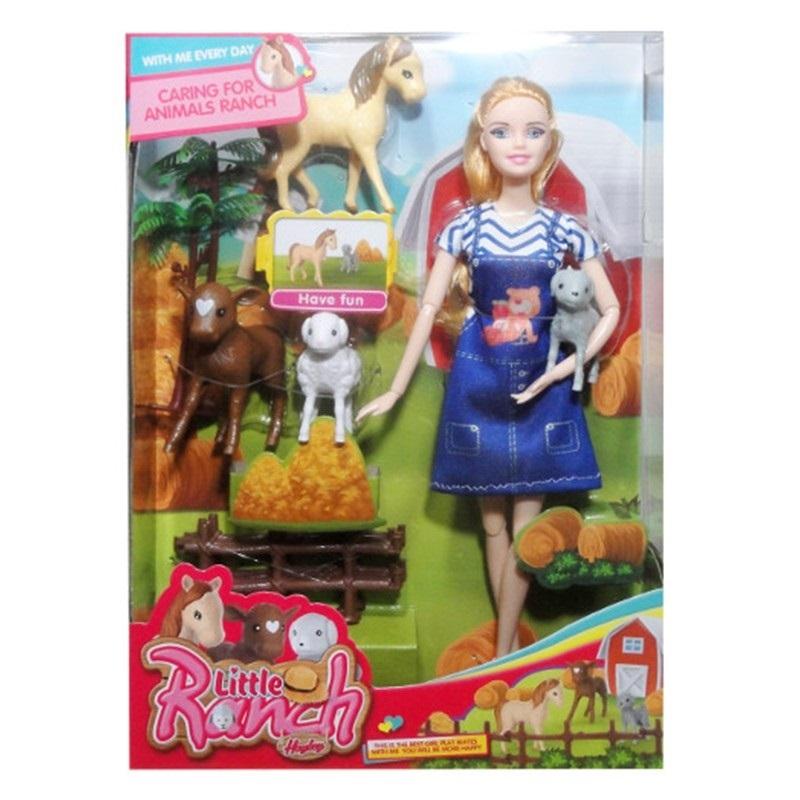 Lalka typu Barbie wraz z 4 zwierzątkami gospodarskimi: konik, krowa, owieczka, piesek. W zestawie także elementy zagrodowego płotu. Produkt dla dzieci od 3 lat. Podane wymiary są wymiarami opakowania. Zabawka zapakowana w kartonowe opakowanie z przezroczystym okienkiem.