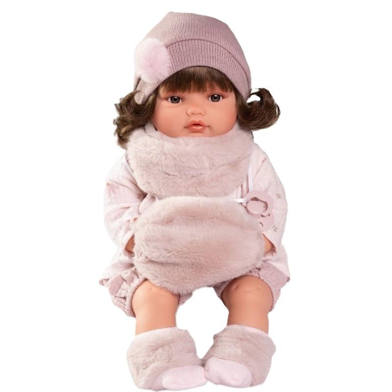 Lalka hiszpańska płacząca Beni z mufką 42 cm Antonio Juan 16383  Jeśli mała wielbicielka wyjątkowych zabawek marzy o hiszpańskiej lali przyjaciółce, idealnej do przytulania, przebierania i czesania, brunetka o imieniu Beni z pewnością wzbudzi zachwyt. Model 16383 z miękkim brzuszkiem, od renomowanego producenta Antonio Juan ma 42 cm wysokości i przypomina małą dziewczynkę. Po wyjęciu smoczka płacze i mówi: mama, papa. Stale otwarte, brązowe oczy o głębokim spojrzeniu opatrzone są długimi rzęsami i delikatnie namalowanymi brwiami.   Lalka hiszpańska Antonio Juan Beni 16383 w modnym stroju Wykonana z wysokiej jakości, przyjemnego w dotyku winylu lalka hiszpańska Antonio Juan 16383 posiada materiałowy brzuszek wypełniony miękką wyściółką. Beni ubrana jest w oryginalny, szyty ręcznie strój, który można zdjąć:  muślinowa pudrowa bluzeczka i krótkie spodenki ładnie prezentują się w komplecie z ciepłą czapeczką, pluszowym szaliczkiem, mufką i skarpetkami, zestaw uzupełnia specjalny smoczek magnetyczny na tasiemce.  Atonio Juan Beni to unikalna lalka hiszpańska na prezent Lalka Beni 42 cm posiada wszystkie wymagane certyfikaty bezpieczeństwa. Jest przeznaczona dla dzieci od 3 roku życia. Wyprodukowana została w całości w Hiszpanii. Zapakowana w biało-różowe, ozdobne pudełko z wieczkiem, świetnie sprawdzi się jako oryginalny prezent dla wielbicielki wyjątkowych zabawek.