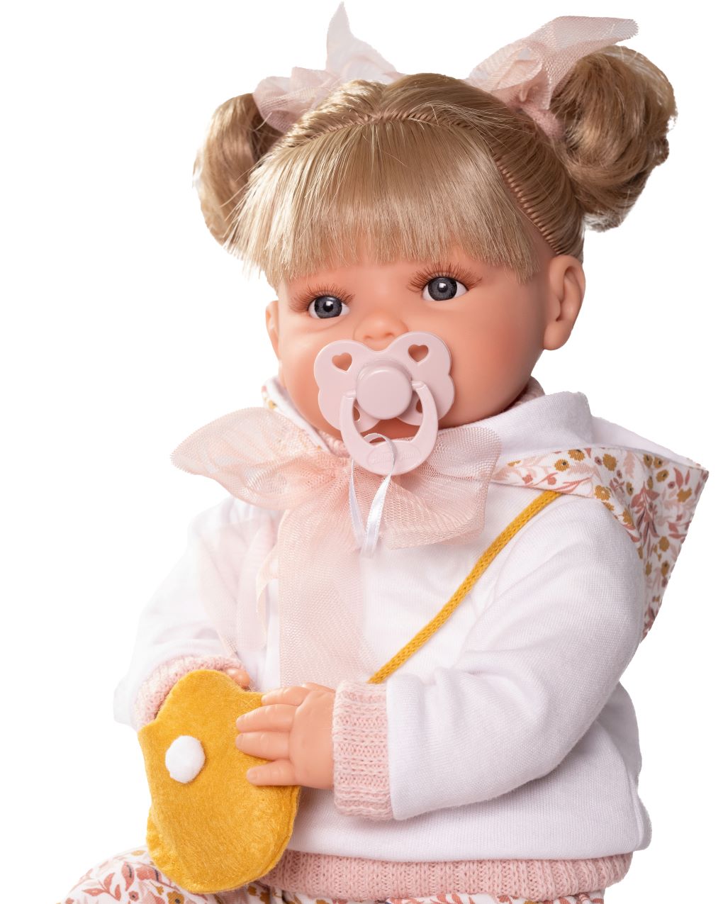 Lalka hiszpańska płacząca Beni z torebką 42 cm Antonio Juan 16384 Jeśli mała wielbicielka wyjątkowych zabawek marzy o hiszpańskiej lali przyjaciółce, idealnej do przytulania, przebierania i czesania, blondynka o imieniu Beni z pewnością wzbudzi zachwyt. Model 16384 z miękkim brzuszkiem, od renomowanego producenta Antonio Juan ma 42 cm wysokości i przypomina małą dziewczynkę. Po wyjęciu smoczka płacze i mówi: mama, papa. Stale otwarte, brązowe oczy o głębokim spojrzeniu opatrzone są długimi rzęsami i delikatnie namalowanymi brwiami.   Lalka hiszpańska Antonio Juan Beni 16384 w modnym stroju Wykonana z wysokiej jakości, przyjemnego w dotyku winylu lalka hiszpańska Antonio Juan 16384 posiada materiałowy brzuszek wypełniony miękką wyściółką. Beni ubrana jest w oryginalny, szyty ręcznie strój, który można zdjąć:  jasny ciepła bluza z kapturem i tiulową kokardą ładnie prezentuje się w komplecie z bawełnianymi długimi spodenkami w roślinny wzór, zestaw uzupełnia specjalny smoczek magnetyczny na tasiemce oraz mała żółta torebka dla lalki.  Atonio Juan Beni to unikalna lalka hiszpańska na prezent Lalka Beni 42 cm posiada wszystkie wymagane certyfikaty bezpieczeństwa. Jest przeznaczona dla dzieci od 3 roku życia. Wyprodukowana została w całości w Hiszpanii. Zapakowana w biało-różowe, ozdobne pudełko z wieczkiem, świetnie sprawdzi się jako oryginalny prezent dla wielbicielki wyjątkowych zabawek.