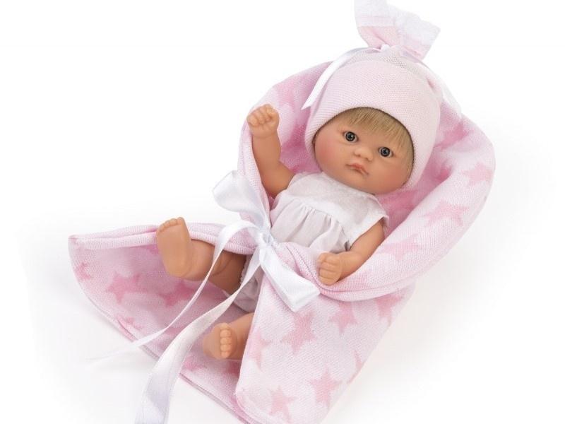 Bomboncin ubrany jest w białe body z krótkim rękawkiem. Nogawki spodenek zakończone są gumkami, aby lepiej dopasowały się do nóżki bobasa. Ubranko jest zapinane na rzepę co ułatwi dziecku zdejmowanie stroju, a zabawa w przebieranie stanie się jeszcze ciekawsza. Wygląd lalki uzupełnia różowa czapeczka wykonana z przyjemnej w dotyku dzianiny oraz ozdobiona wstawkami z białek koronki. Dodatkowo komplet uzupełnia jasnoróżowy kocyk z motywem w gwiazdki. Mięciutki w dotyku dodatek sprawdzi się idealnie podczas spaceru i przenoszenia bobasa. Wystarczy położyć laleczkę i zawiązać koc wstążką aby móc ją przenieść. Można ją przebierać bez końca, przytulać oraz zabierać ze sobą na drzemkę.