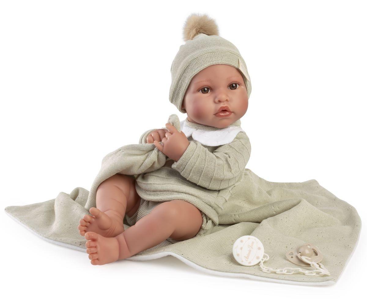 Zaprojektowana i stworzona z dbałością o każdy detal, lalka hiszpańska 50439 to wyjątkowy projekt Antonio Juan. Jedna z najbardziej rozpoznawalnych marek proponuje uroczego chłopca o słodkiej twarzyczce, w zestawie z miękkim kocykiem. 42- centymetrowy bobas przypomina prawdziwe niemowlę. Ma zaznaczoną płeć. Jest wykonany z gładkiego, miękkiego, bezpiecznego dla dzieci winylu. Zachwyca wysokiej jakości szyty ręcznie sweterkowy strój w modnym odcieniu zieleni.