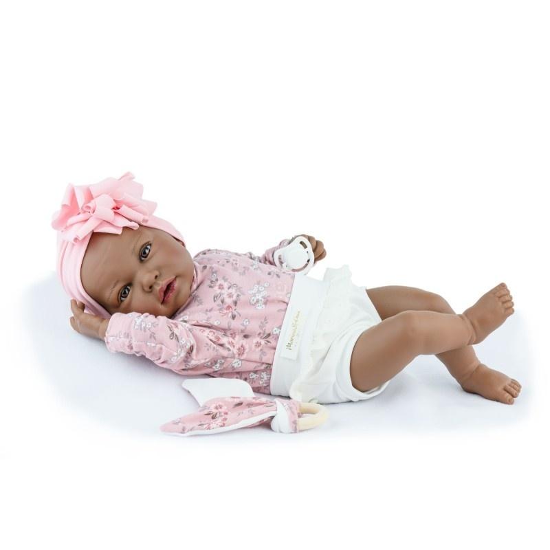 Przepiękna, czarnoskóra dziewczynka o imieniu Gala to wyjątkowy, 45-cm. bobas z kolekcji ekskluzywnych lalek hiszpańskich cenionej marki Marina & Pau. Posiada duże, niebieskie oczy wyglądające jak prawdziwe, a ich oprawa została podkreślona gęstym wianuszkiem rzęs oraz delikatnym zarysem ręcznie malowanych brwi. Model 1234 ma skrupulatnie wyrzeźbione włoski na przyciemnionej główce. Miękki brzuszek w kolorze skóry sprawia, że lalka świetnie nadaje się do przytulania. Niewątpliwym atutem jest też wysokiej jakości, bawełniany, ręcznie szyty strój w typowo dziewczęcej wersji. Uroku dodaje stylowa różowa opaska na główkę. W zestawie także smoczek oraz gryzak. Zabawkę proponujemy dzieciom w wieku od 3 lat.