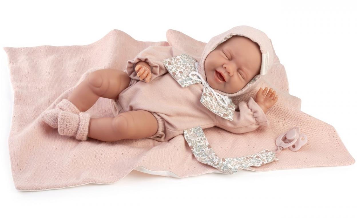 Realistycznie wyglądający bobas posiada wyrzeźbione włoski oraz delikatnie malowane brwi, paznokcie, linie papilarne i fałdki. Wiotka główka lekko opada, co dodaje zabawie realizmu. Luna od marki Antonio Juan ubrana jest w dzianinowe body z eleganckim wzorzystym kołnierzykiem oraz wiązaną czapeczkę. Wszystkie elementy garderoby można łatwo zdjąć, a maleństwo przebrać w inne ubranka. W zestawie znajduje się także smoczek przymocowany do stroju oraz dwustronny miękki kocyk.