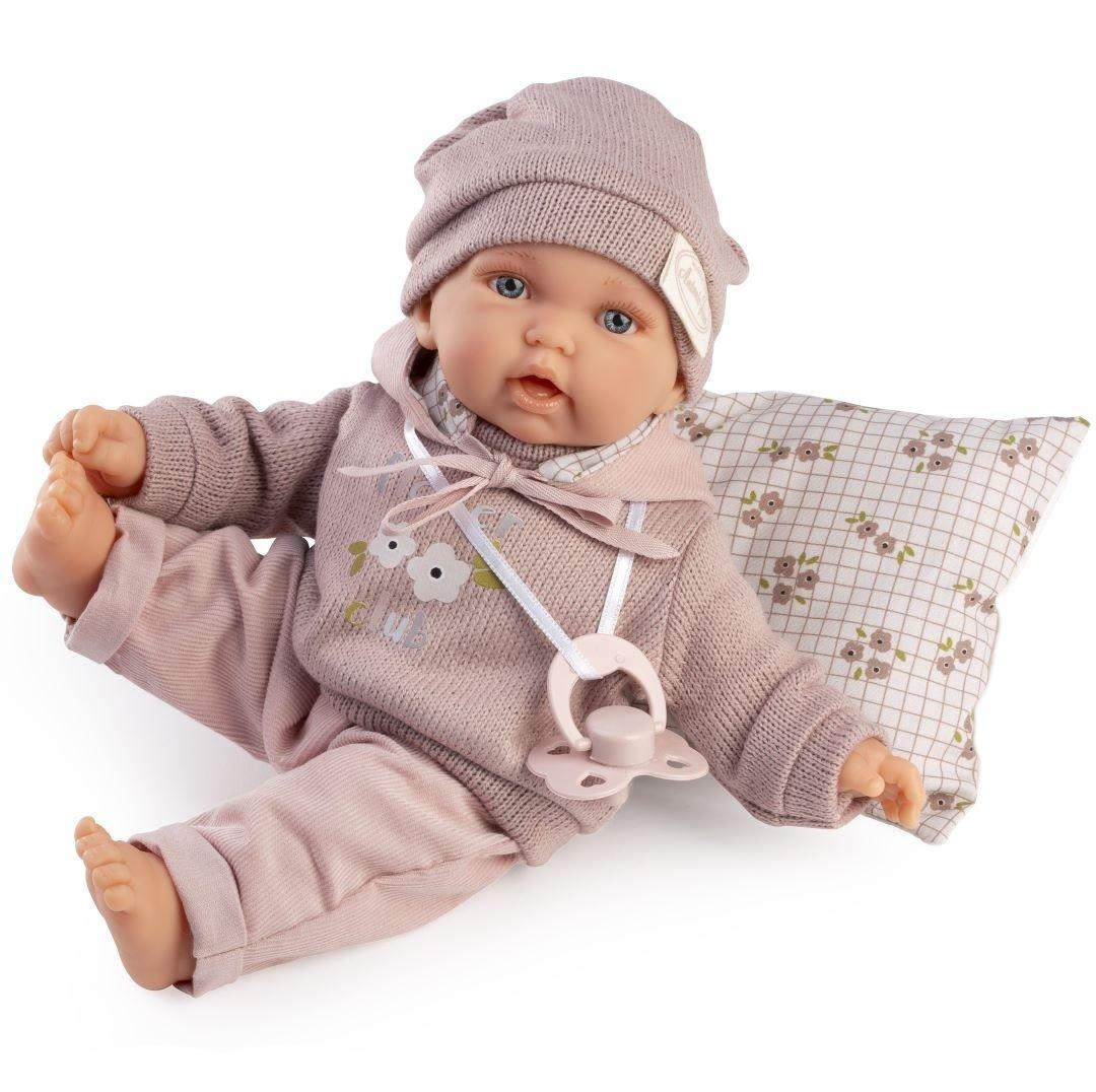 Lalka hiszpańska Petit 12444 jest ubrana w ciepły sweterek z kapturem w kolorze pudrowego różu, ozdobiony kwiatuszkową aplikacją, oraz sztruksowe spodnie. Całość dopełnia czapeczka oraz smoczek zawieszony na satynowej tasiemce. W komplecie także poduszeczka w kratkę, który uatrakcyjnia zabawę w odgrywanie roli troskliwej mamusi. Wszystkie części garderoby można z łatwością zdjąć, a bobasa przebrać. Luksusu dodaje firmowe kartonowe, solidne, pięknie zaprojektowane pudełko.