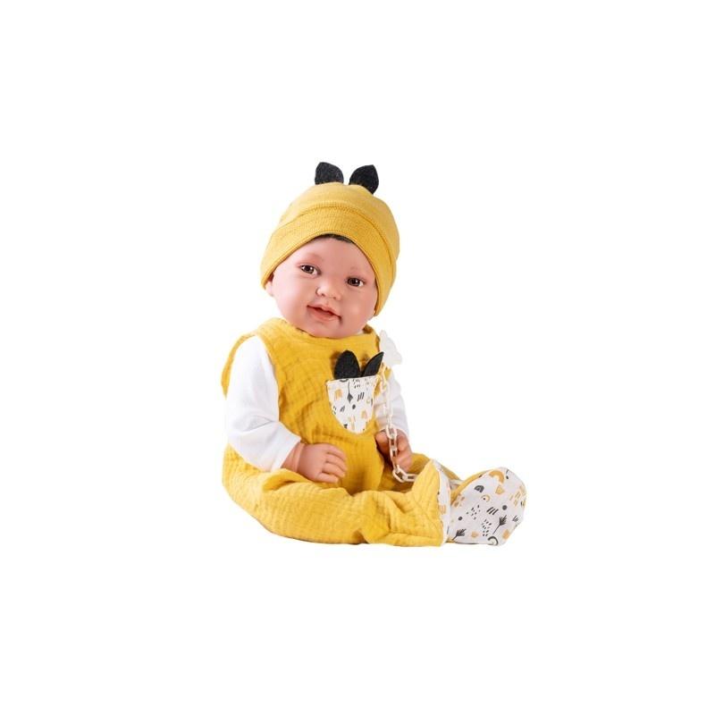 Urodę dzidziusia podkreśli modna stylizacja. Chłopiec ma na sobie ładny kombinezon w kolorze musztardowym i wsuwaną czapkę z czarnymi uszami. Całą stylizację wykańcza pasiasta poduszka zwieńczona pluszowymi pomponami. Przyjemna w dotyku podusia pozwoli otulić chłopca do snu. Dodatek sprawdzi się także jako wypełnienie wózka czy kołyski. Wszystkie ciuszki łączą się ze sobą kolorem i wzorem, co sprawia, że w całości zestaw prezentuje się doskonale. Ciuszki można zdjąć i przebierać chłopca bez końca. Natomiast kiedy Pipo jest śpiący możesz włożyć smoczek, a on wtedy spokojnie będzie leżakował na podusi. Dzięki funkcjonalności nasza pociecha nabiera wprawy przy przebieraniu i uczy się codziennych obowiązków, które nie raz na początku mogą sprawiać trudności.