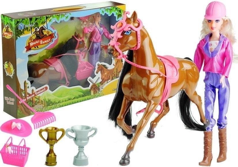 Zestaw stajnia - lalka i koń Prezentowany zestaw składa się z dużego, brązowego konia, lalki-trenerki oraz wielu akcesoriów, które są niezbędne do pracy w stajni. Brązowy koń o imponującym rozmiarze posiada piękną grzywę i ogon w kolorze głębokiej czerni, które nie tylko błyszczą, ale są niebywale przyjemne i miękkie w dotyku. Dziewczynka będzie mogła przeczesywać grzywę specjalnym grzebieniem, by następnie móc ozdobić konia warkoczami lub innymi, wymyślonymi przez siebie fryzurami. Brązowy koń posiada miękkie siodło, które ozdobione jest eleganckimi ornamentami, a także uprząż z czerwonym brylantem, połączoną z lejcami. Lalka trenująca konia posiada smukłą sylwetkę i długie, lekko kręcone włosy. Ubrana jest w dwuczęściowy strój z połyskującego materiału, który można urozmaicić dołączonymi do zestawu kowbojkami na obcasie. W zestawie znajduje się czapka dżokejska, w którą można ubrać lalkę, gdy jeździ na koniu, oraz kapelusz z szerokim rondem, przydatny podczas szczotkowania i opieki nad zwierzęciem. Duży kosz piknikowy zmieści do środka przysmak konia, czyli marchewki, a także zdobyte trofea. W komplecie znajdują się również grabie, konieczne podczas sprzątania w stajni. Ten wieloelementowy komplet posiada wszystko, co jest potrzebne do udanej zabawy. Dziewczynka może zajmować się koniem, karmić i czesać go, a także organizować wesołe pikniki. Zestaw zapakowany jest w wielokolorowe kartonowe pudełko z witrynką, co sprawia, że doskonale nadaje się na prezent. Ze względu na rozmiar niektórych elementów, zabawka z certyfikatem CE przeznaczona jest dla dzieci, które ukończyły 3. rok życia. W skład zestawu stajni wchodzą: - brązowy koń, - lalka, - koszyk na akcesoria, - pęk marchewek, - kapelusz, - czapka dżokejska, - buty na obcasie, - szczotka, - grzebień, - grabie, - złoty i srebrny puchar. Wymiary poszczególnych elementów zabawki: - koń: 30 cm x 25 cm, - lalka: 30 cm, - kosz na akcesoria: 8,5 cm x 5,5 cm, - grabie: 15,5 cm. Wymiary opakowania: - 34,5 cm x 9 cm x 47 cm.
